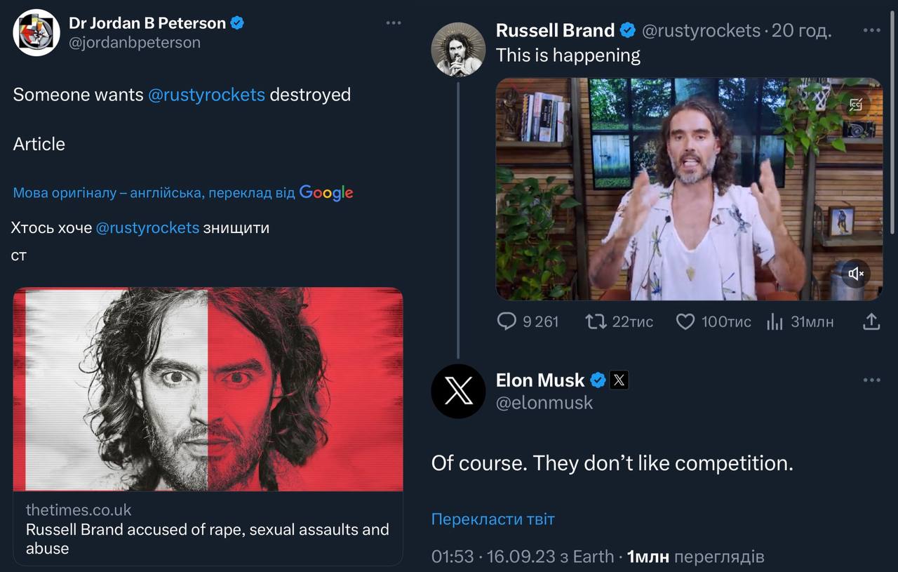Заходять якось в Твіттер наркоман (Пітерсон), імбіцил (Маск) і педофіл, так як почали бороти істеблішмент 😂