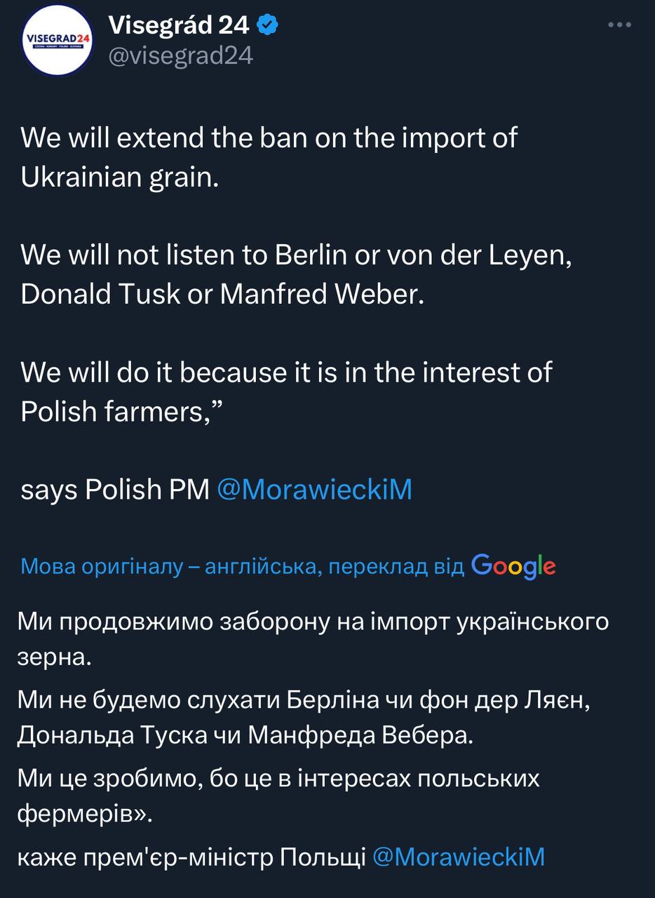 Поляки праві в тому, що історія з зерном за задумом була в тому, щоб дати нам можливість вивозити зерно на наші традиційні ринки, а не засипати їм Європу. І напевно коли історія тільки почалася, нам треба було знайти рішення, як це зробити, але ми вирішили захищати інтереси агрохолдингів, а не стратегічні державні інтереси (я про це казав і скажу ще раз: це буде наше ярмо після війни - занадто великих вплив агрохолдингів на державну політику, з чим треба буде щось робити, якщо ми не хочемо бути білим Буркіна-Фасо).