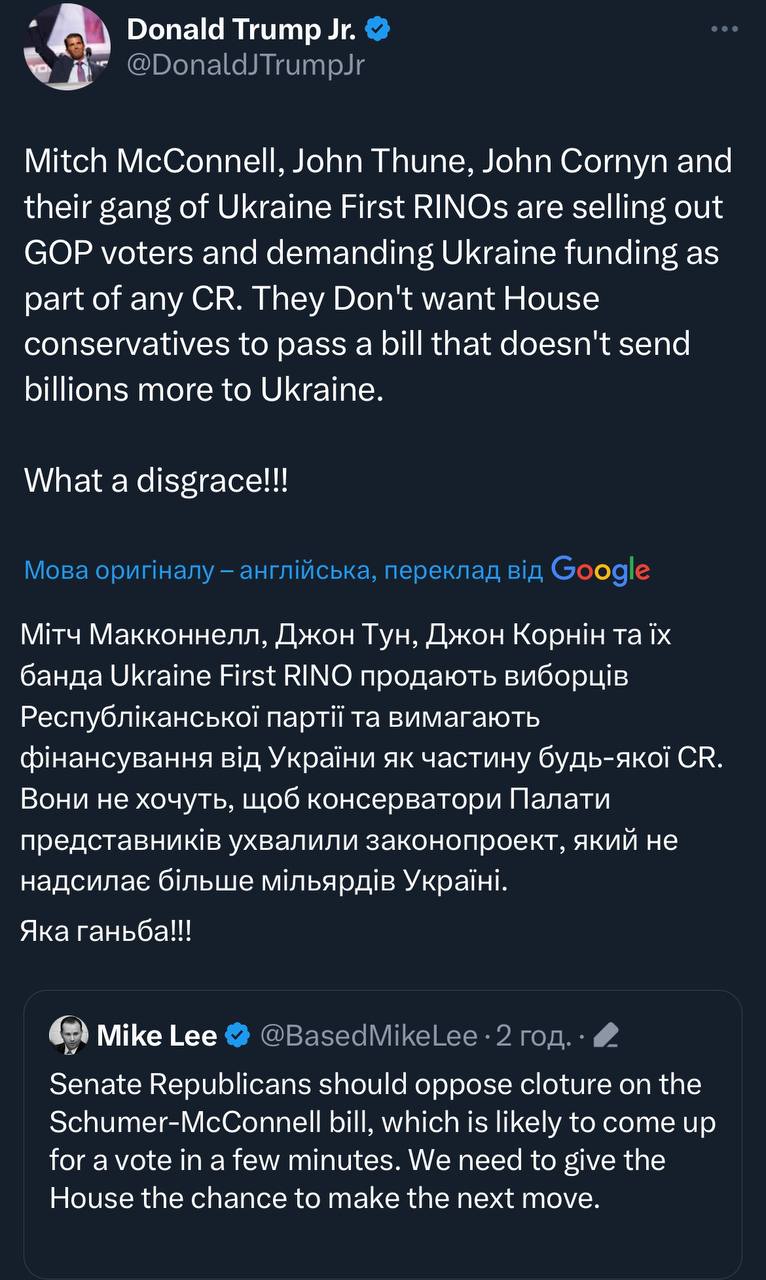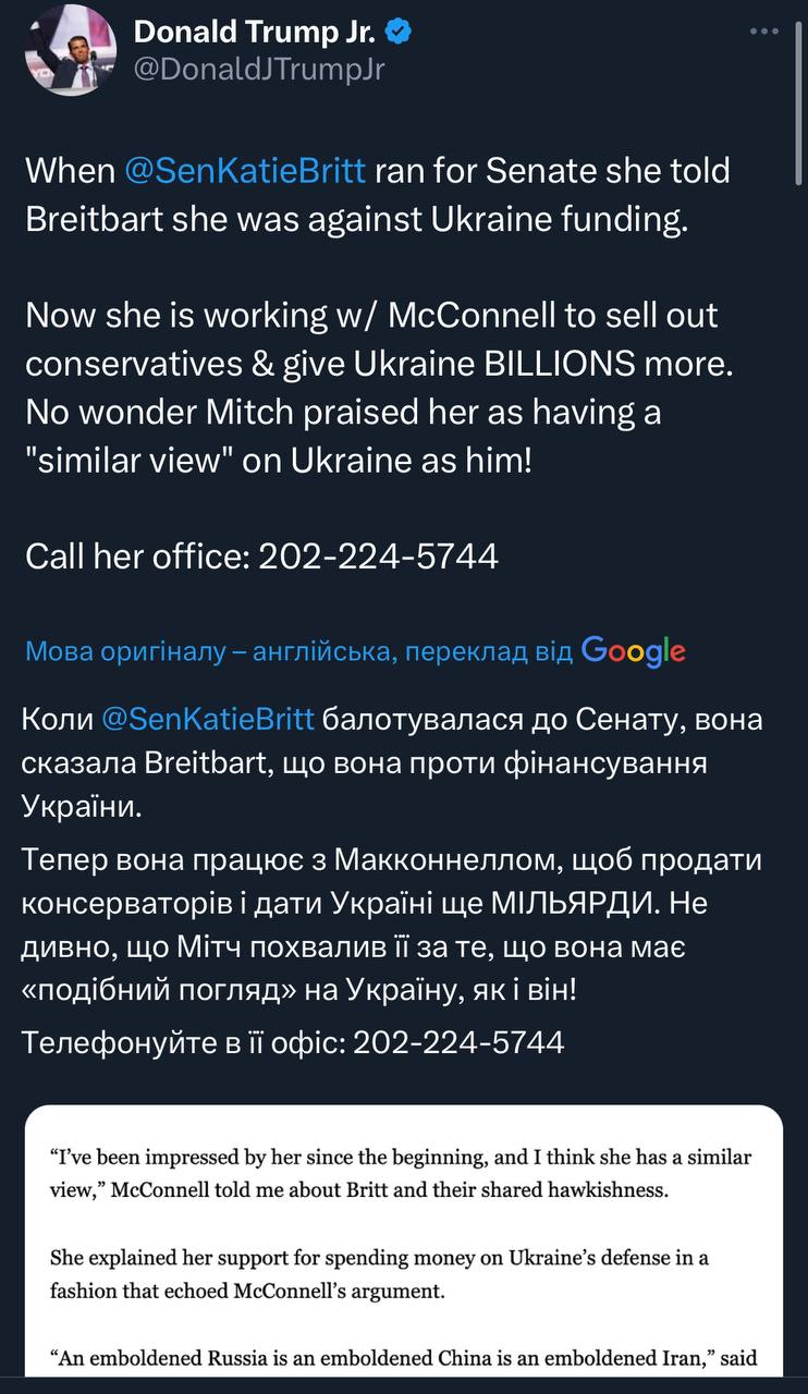 Вилупок Трампа закликає фанатиків тиснути на сенатора проти фінансування України.