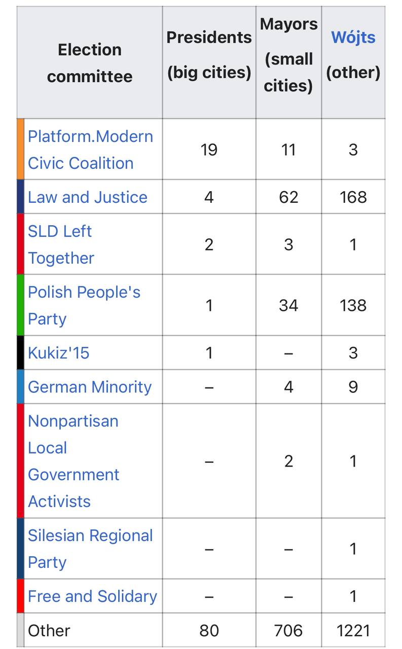 На останніх місцевих виборах ПіС виграв лише 4 посади голів великих міст, зате 62 в містечках і 168 войтів в селах.
