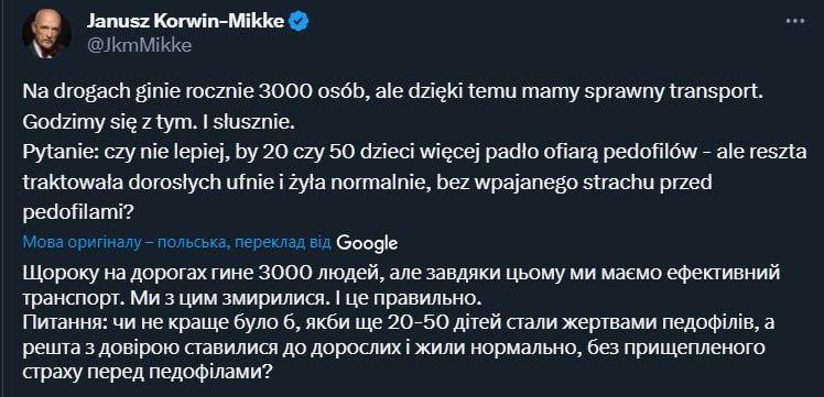 Я погуглив, такі так - один з лідерів Конфедерації Януш Корвін-Мікке пару років тому реально казав, що педофілія норм.
