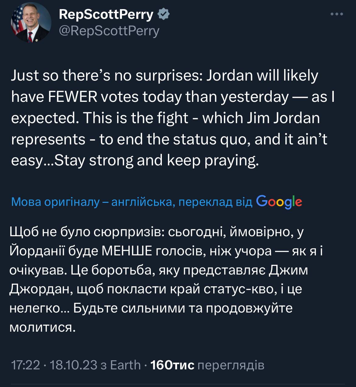 Виставили Тома Коула з Оклахоми, якого поважають в різних таборах GOP, представляти Джордана. Цікавий крок. Пару днів тому було навіть не зрозуміло чи Коул підтримає Джордана 🤔
