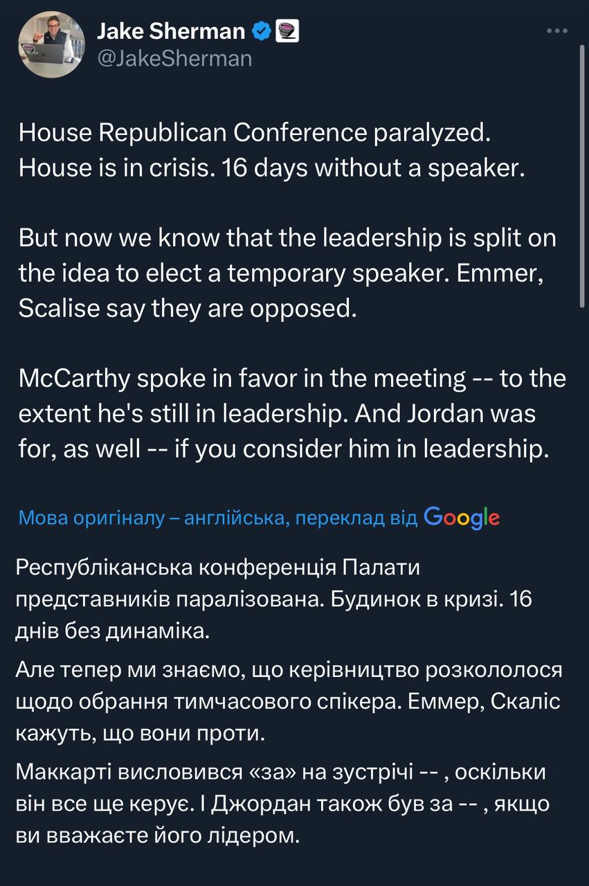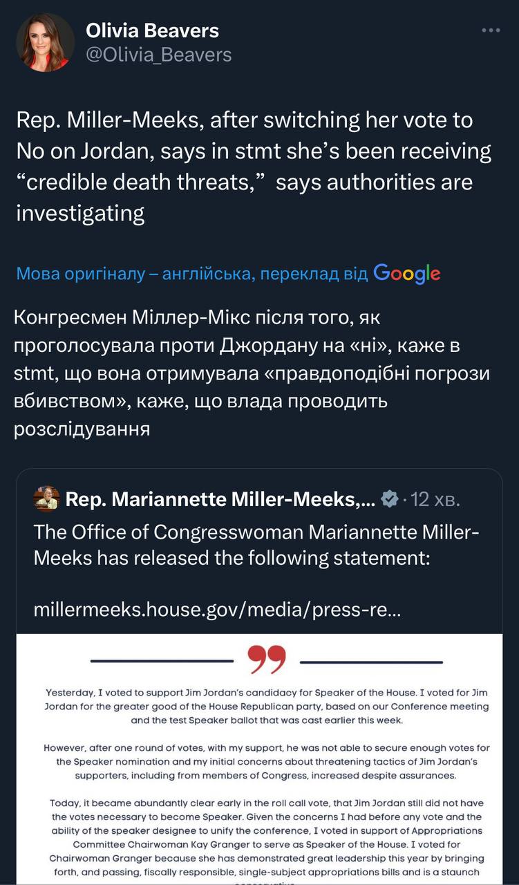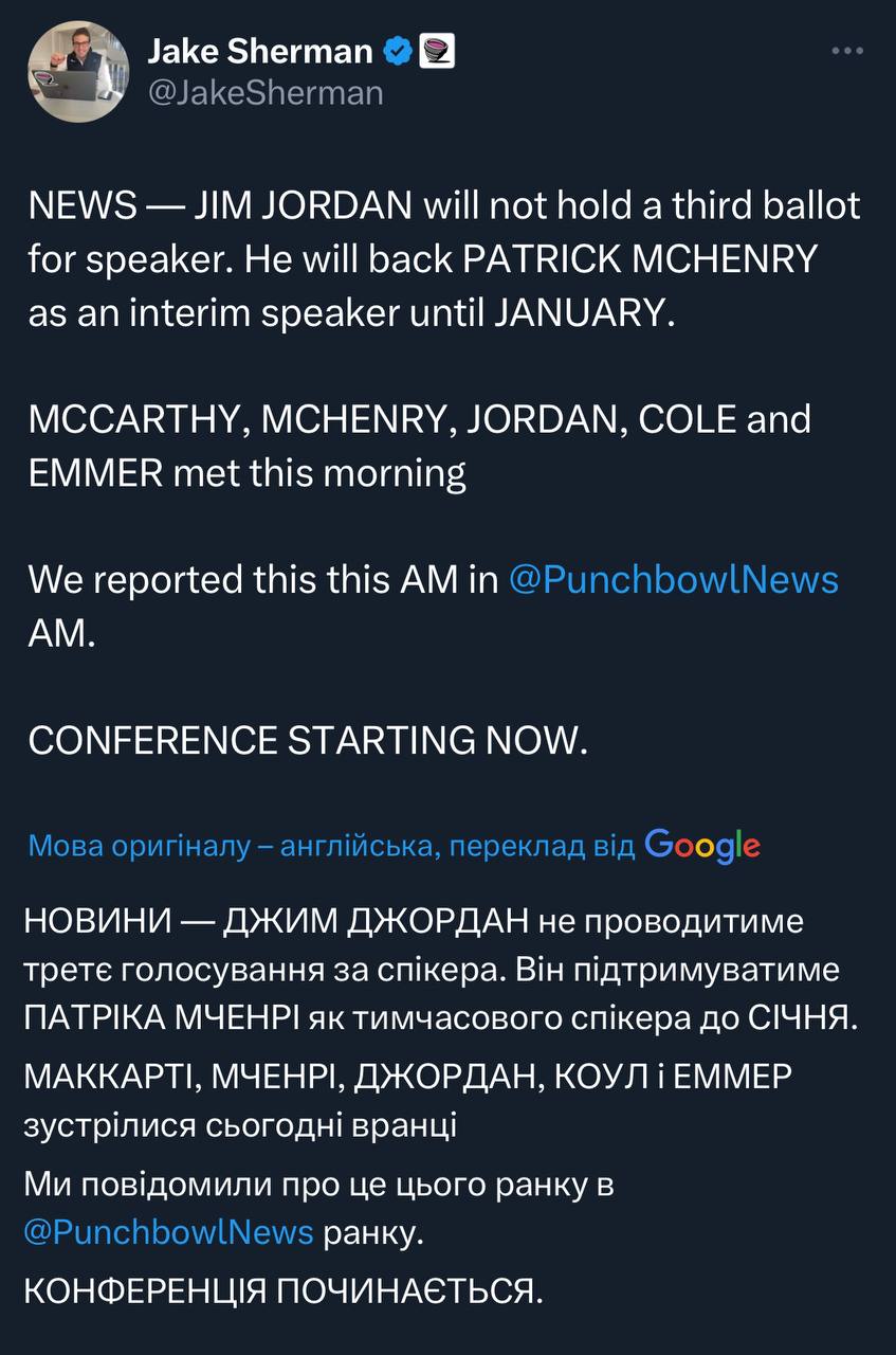 Виставили Тома Коула з Оклахоми, якого поважають в різних таборах GOP, представляти Джордана. Цікавий крок. Пару днів тому було навіть не зрозуміло чи Коул підтримає Джордана 🤔