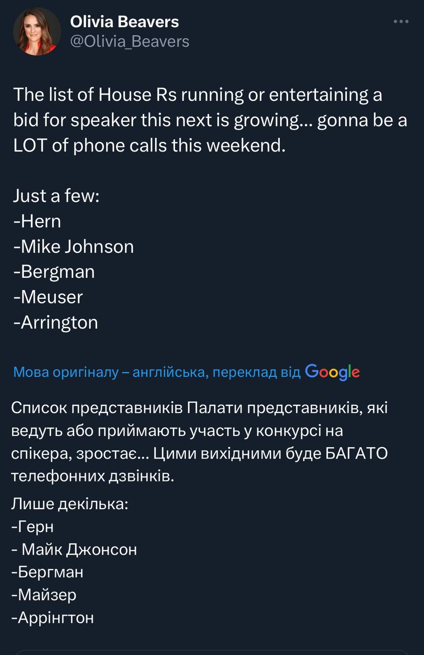 3. Шість центристів разом з демократами обирають поміркованого республіканця спікером або взагалі Джеффріса. Це можливо лише якщо ці "шість відчайдушних" вирішать завершити свою політичну кар'єру, бо майбутнє в нинішній GOP в них доволі примарне. І якщо на це підуть демократи, я не впевнений, що демократи цього бажають і їхня головна ціль, як каже Джеффріс це "функціонування держави", більш схоже, що вони грають на хаос поки, хоча шатдаун в світлі поганих рейтингів Байдена їм не на користь теж.