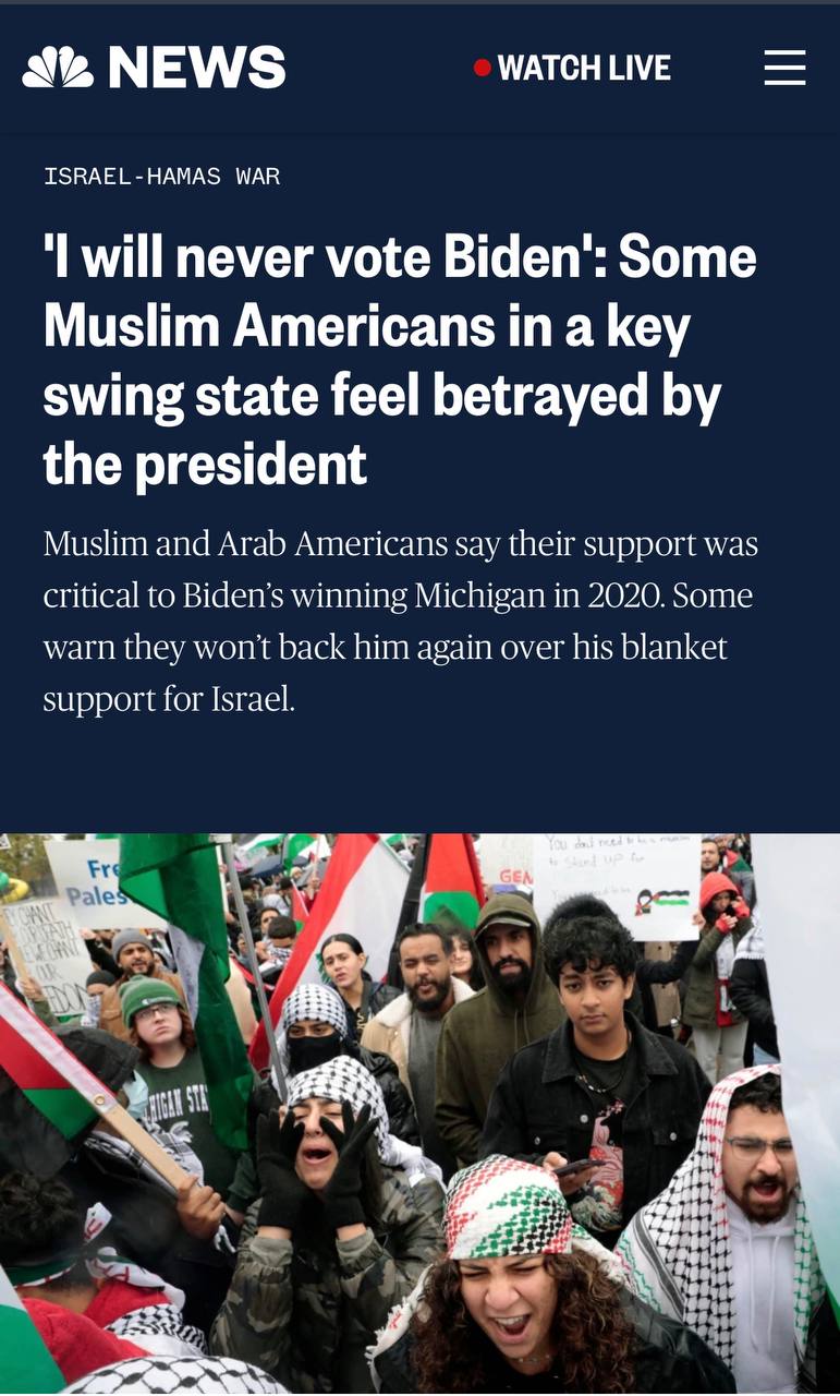 ​​До речі ще одна проблема. Мусульмани проживають переважно в Мічігані та Міннесоті. В обох штатах гонка близька (Мічіган 44-44, Міннесота 40-38 на користь Байдена).
