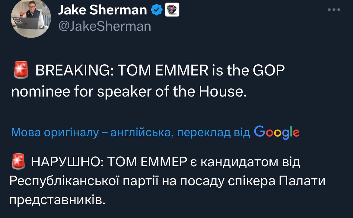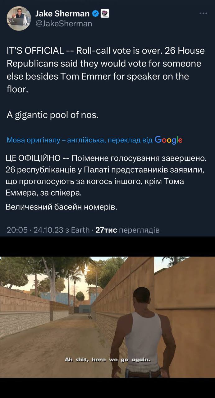 Погана новина: Метт Гетц намагається бути посередником між ним і радикалами. Звісно Гетц хоче залишити собі статус «kingmaker’а». Чому погано? Бо якщо Еммер обернеться голосами лише республіканців, скоріше за все це буде Маккарті 2.0. Краще ніж Джордан чи Дональдс, але і проблем багато.