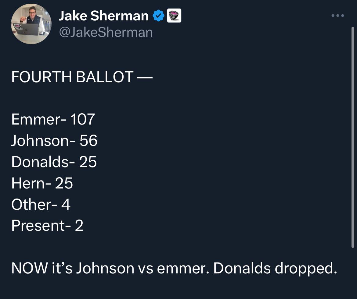 Залишилось двоє Еммер та Джонсон. Дональдс сам вийшов, схоже трампісти хочуть обʼєднати голоси навколо Джонсона 🤔