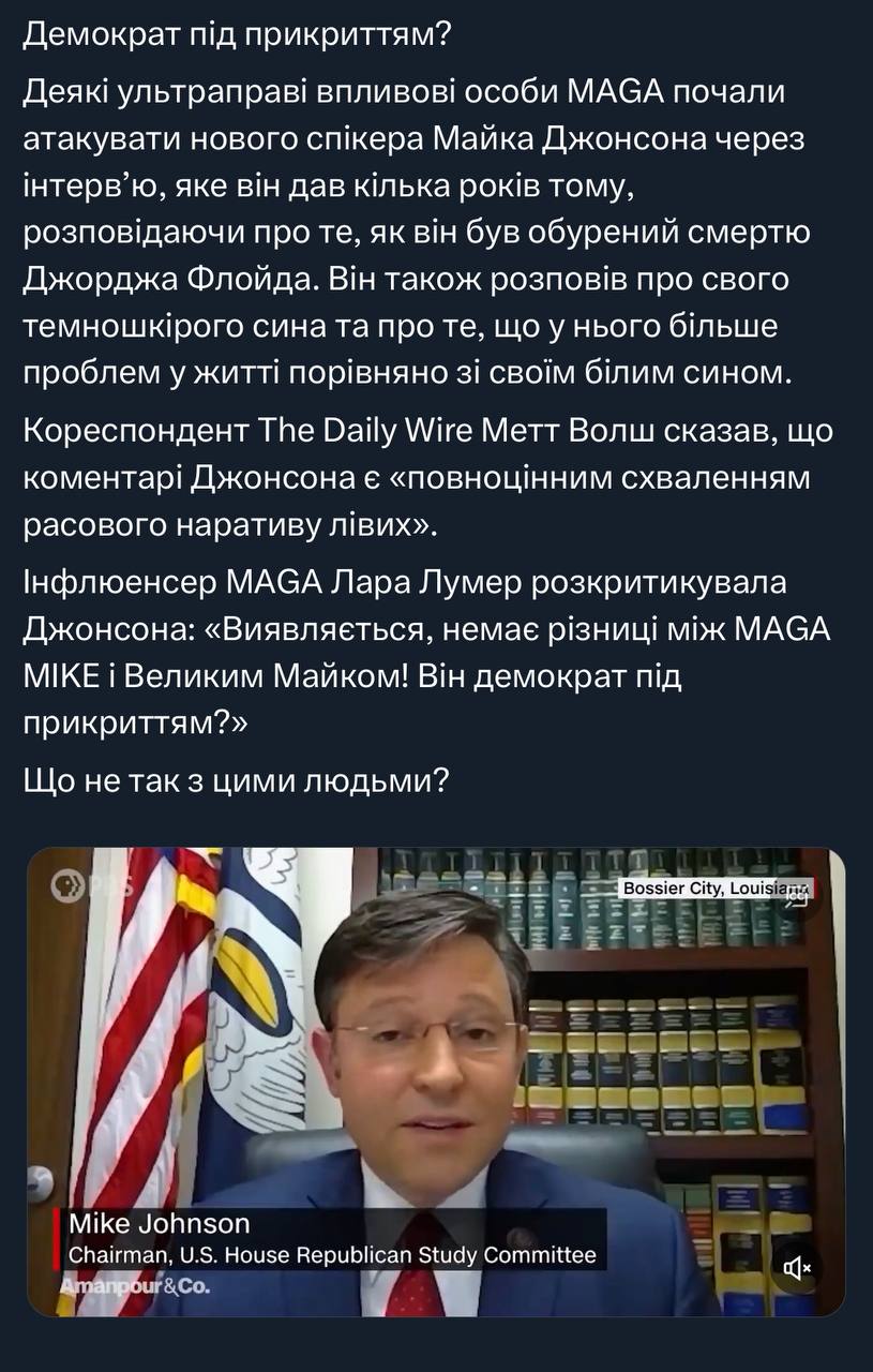 "Як тільки республіканці обрали Майка Джонсона спікером, дипломати, що тісно працюють з Вашингтоном опустили голови...і почали гуглити.