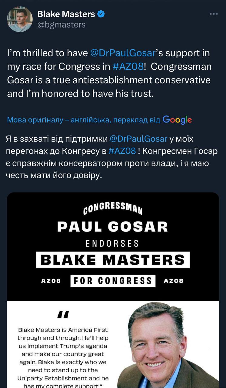 Тут Блейк Мастерс (Першу світову війну організували Ротшильди), якого підтримує Пол Госар (розіслав конгресменам листа з посилання на сайт, де славили Гітлера) буде змагатись за номінацію з Ейбом Хамаде (який досі подає позови про те, що вибори були «сфальсифіковані» і програє їх), якого підтримала Кері Лейк (яка оголосила себе «справжнім губернатором Арізони», після того як програла вибори).