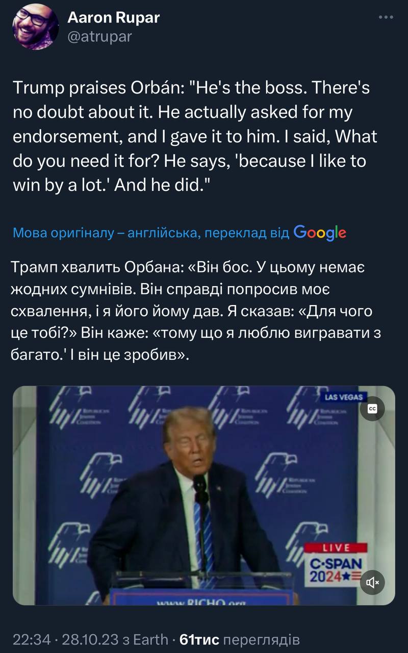 Якби не Трамп, Орбан не став би лідером Туреччини. Повний і беззаперечний endorsement Віктору 🤣
