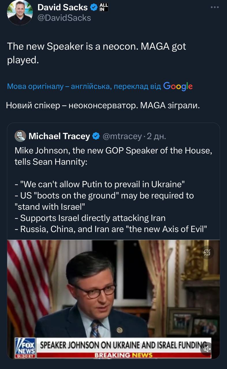 Так, Ніккі права. І хай навіть Трамп ще матиме ракурс завдяки Кушнеру, а ця варіація партії ще має достатньо республіканців старої школи та південних євангелістів (Майк Джонсон яскравий приклад перехідної фігури), але пост-трампівські популісти будуть фігурами Пета Бьюкенена і постраждають усі без виключення союзники США, якщо вони остаточно захоплять партію