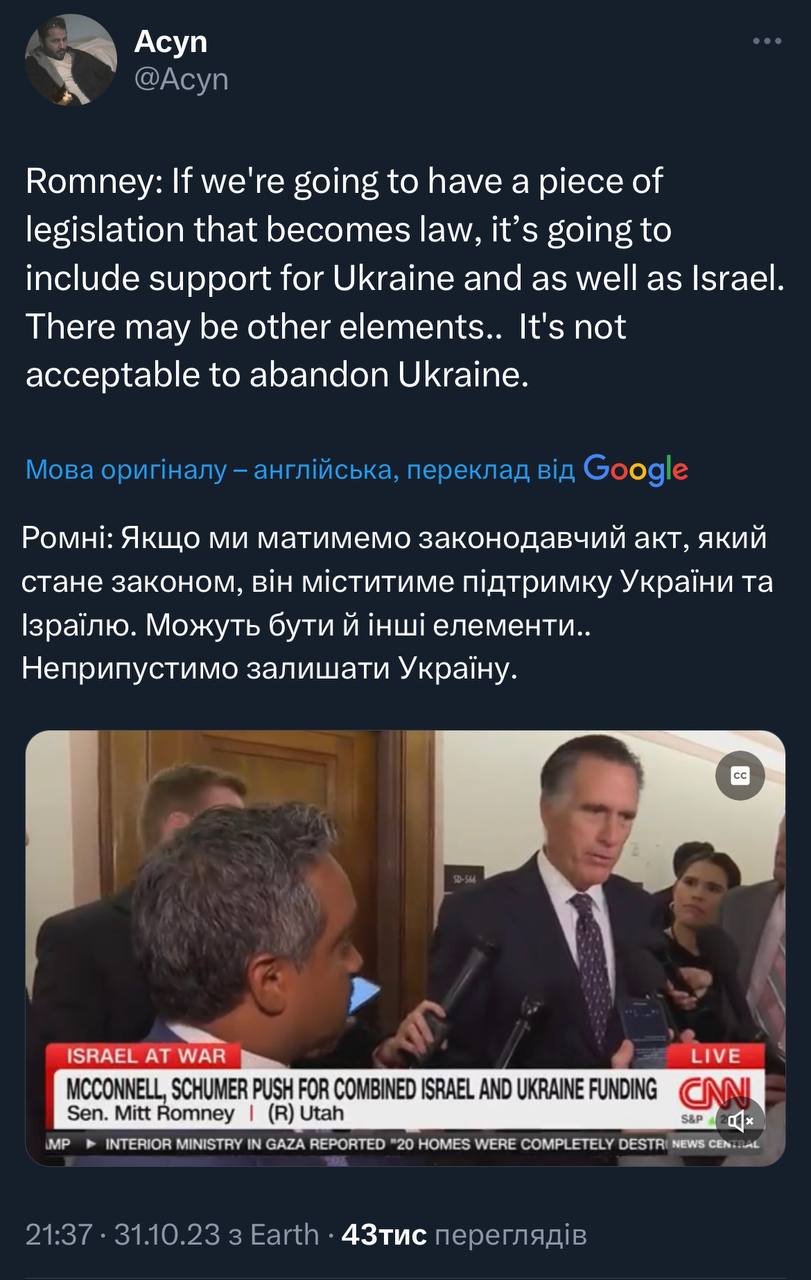 "Шлях вперед надзвичайно зрозумілий. Ми маємо прийняти запит президента, який містить фінансування для Ізраїлю, України, південної частини Тихого океану, одночасно надаючи гуманітарну допомогу Газі. Америка не має розкоші ховати голову в пісок або залишати друзів напризволяще" - заявив Шумер".