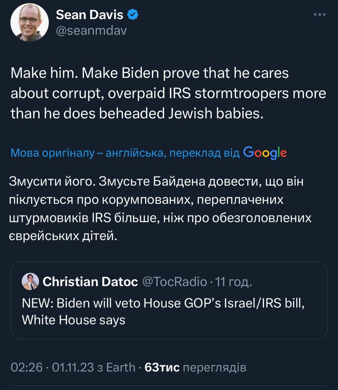 Це CEO колись пристойного видання The Federalist - цинічно використовує вбивства людей для протягування своєї повістки. Йому важливіше, щоб Байден наклав вето більше ніж допомога Ізраїлю.