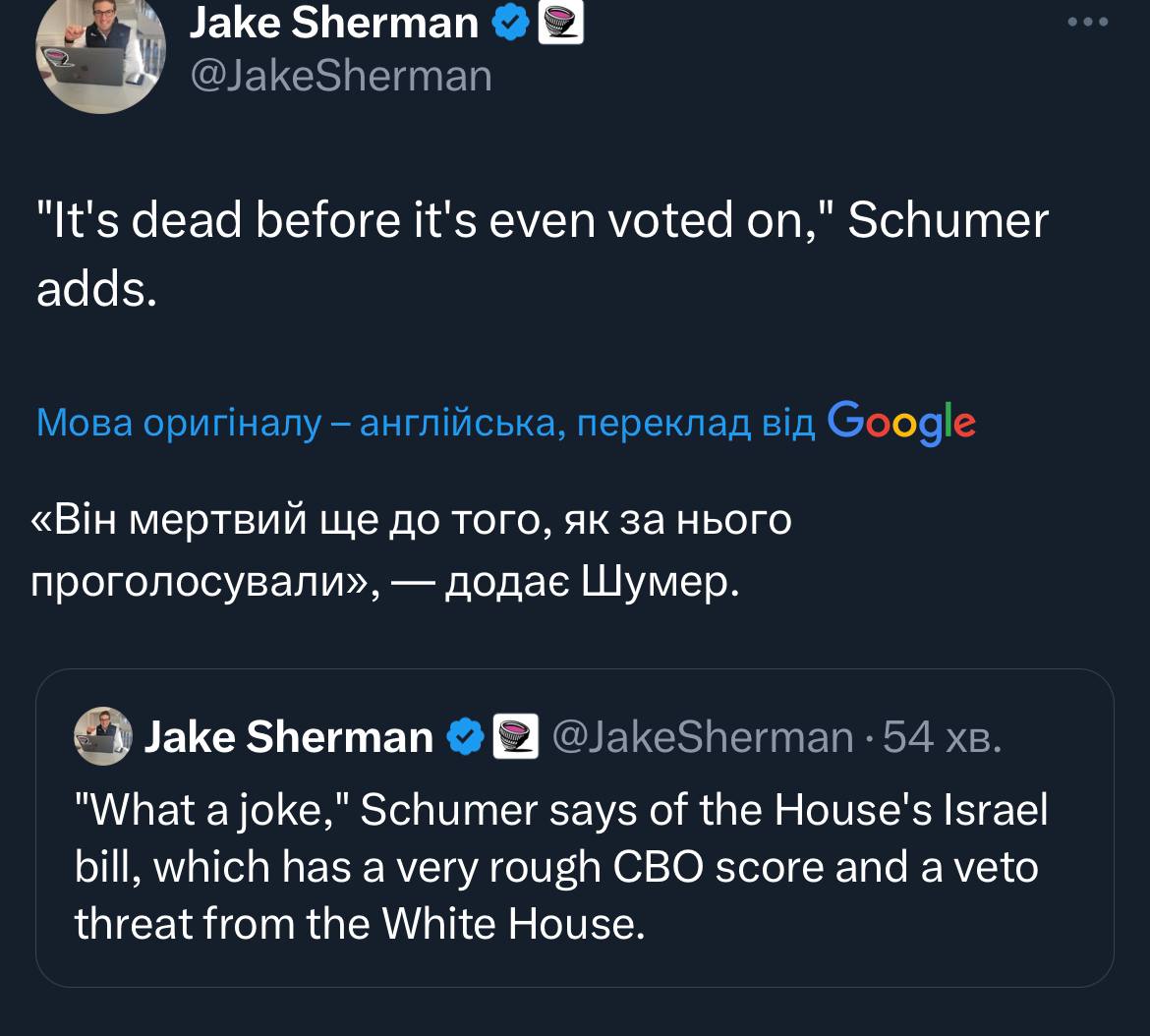 "Шлях вперед надзвичайно зрозумілий. Ми маємо прийняти запит президента, який містить фінансування для Ізраїлю, України, південної частини Тихого океану, одночасно надаючи гуманітарну допомогу Газі. Америка не має розкоші ховати голову в пісок або залишати друзів напризволяще" - заявив Шумер".