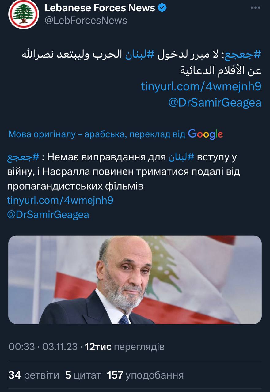 Християнська партія Лівану «Ліванські сили» заявила, що Хезболла не має втягувати Ліван у війну з Ізраїлем та що Хасан Насралла має припинити розповсюджувати пропаганду