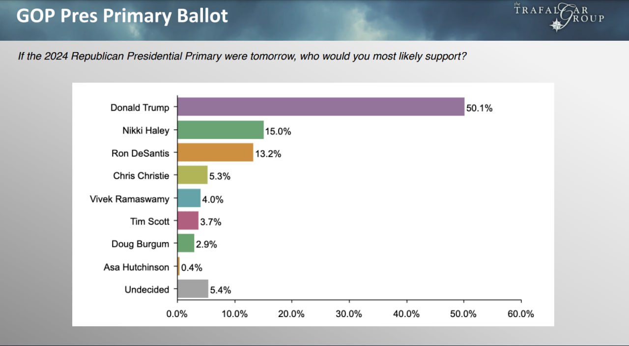 Опитування від Trafalgar показує, що Ніккі Хейлі вперше випередила Де Сантіса в національному масштабі.