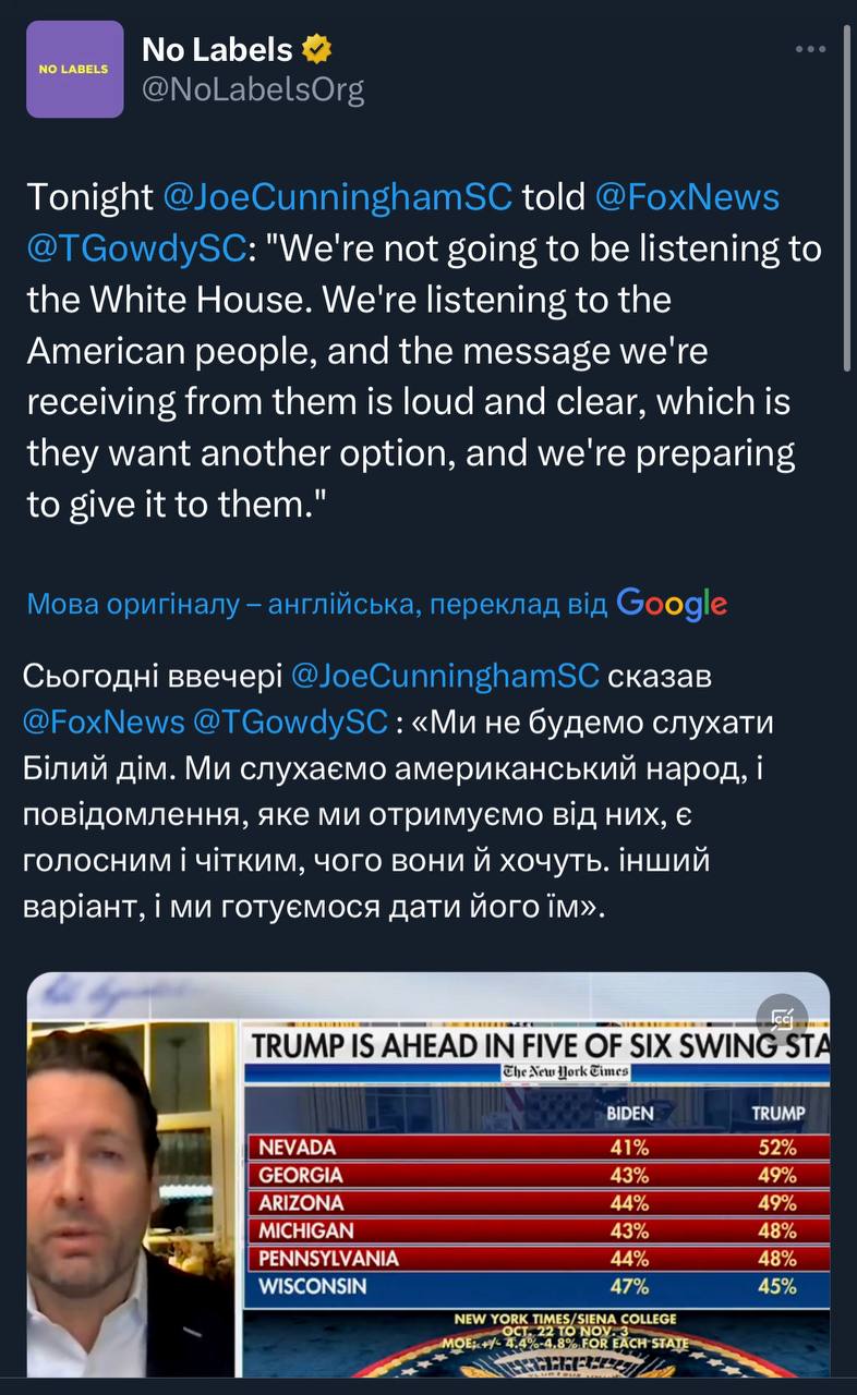 Колишній конгресмен від Демократичної партії (Південна Кароліна) Джо Канінгем, який зараз представляє групу No Labels, обʼєднання поміркованих республіканців та демократів, сказав, що останні опитування свідчать, що американців дістали і Трамп, і Байден і вони хочуть других опцій, які група «збирається їм надати».