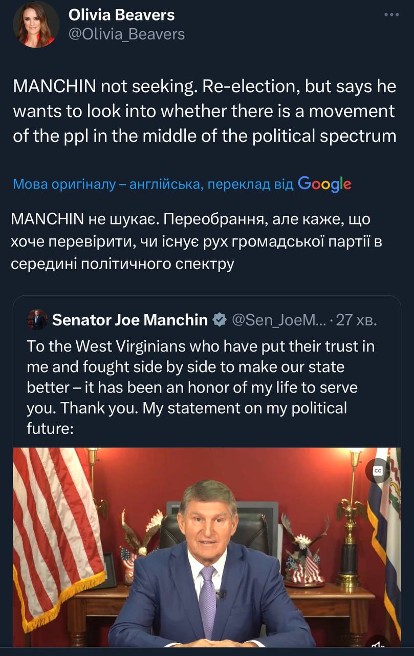 Сенатор демократ Джо Менчін (Західна Вірджинія) каже, що не буде переобиратись, але буде «шукати рух посередині», скоріше за все остаточно піде до No Labels.