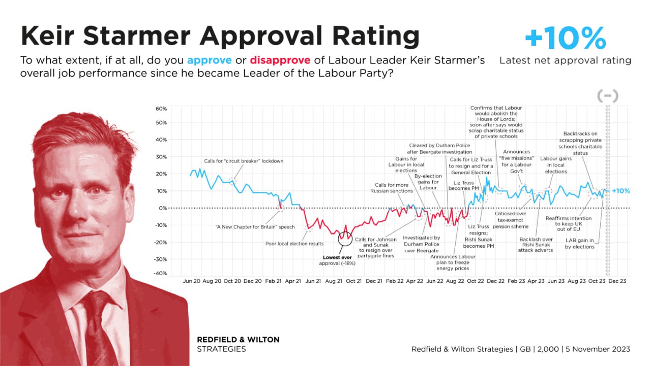 І що? Вперше за два роки в рейтингу схвалення у нього позитивна маржа (у Сунака -16%). Британцям подобається, що він позбавився лівих.