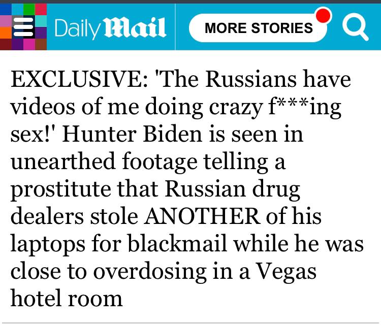 Daily Mail опублікувало відос, де Байден-молодший голяка розповідає якійсь голій шльондрі, що у 2018 році, коли він обдовбався наркотою у Вегасі до безтями російський барига викрав його ноутбук, де були записи його збоченого сексу і шантажував його.