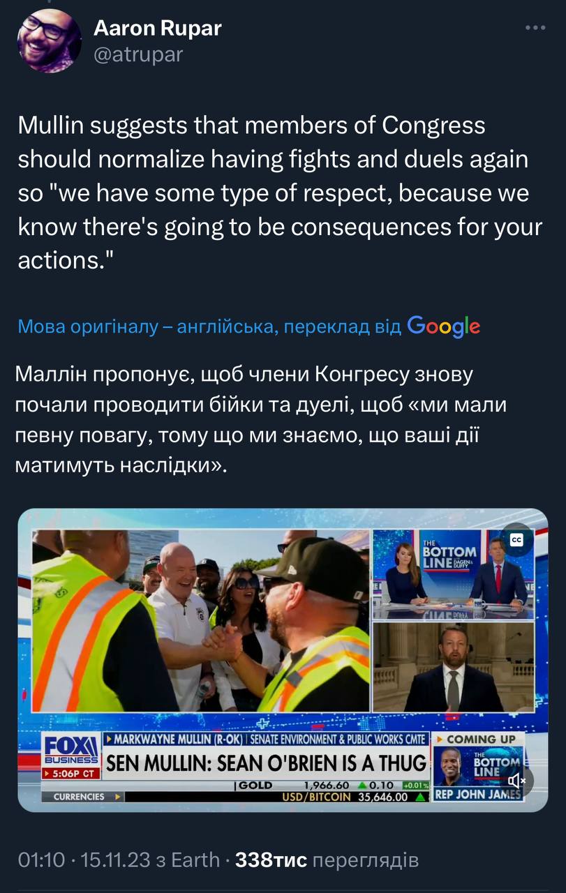 Сенатор від Оклахоми Марквейн Маллін намагався почати бійку з Шоном ОʼБрайеном (головою однією з профспілок) в Сенаті, бо той колись в Твіторі назвав його клоуном і ковбоєм 😂