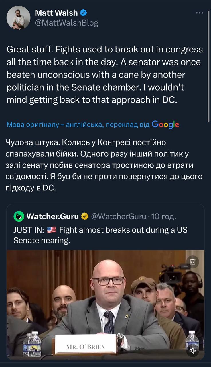 Сенатор від Оклахоми Марквейн Маллін намагався почати бійку з Шоном ОʼБрайеном (головою однією з профспілок) в Сенаті, бо той колись в Твіторі назвав його клоуном і ковбоєм 😂