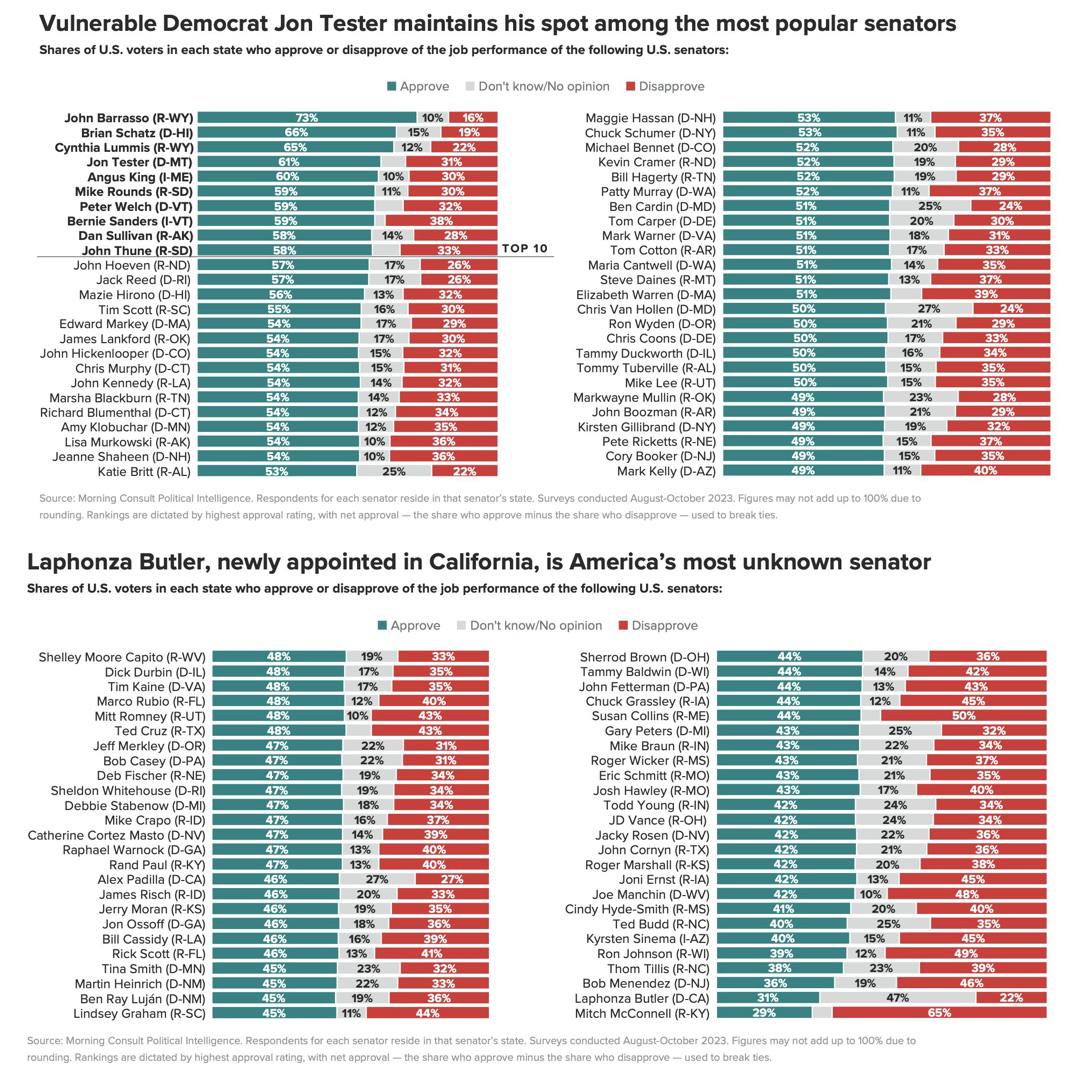 Цікаво, що демократ Джон Тестер з Монтани входить в 10-ку найпопулярніших сенаторів. Монтана червоний штат і вважається, що у 2024 році скоріше за все демократи втратять це місце, але зважаючи на популярність Тестера, все може бути.