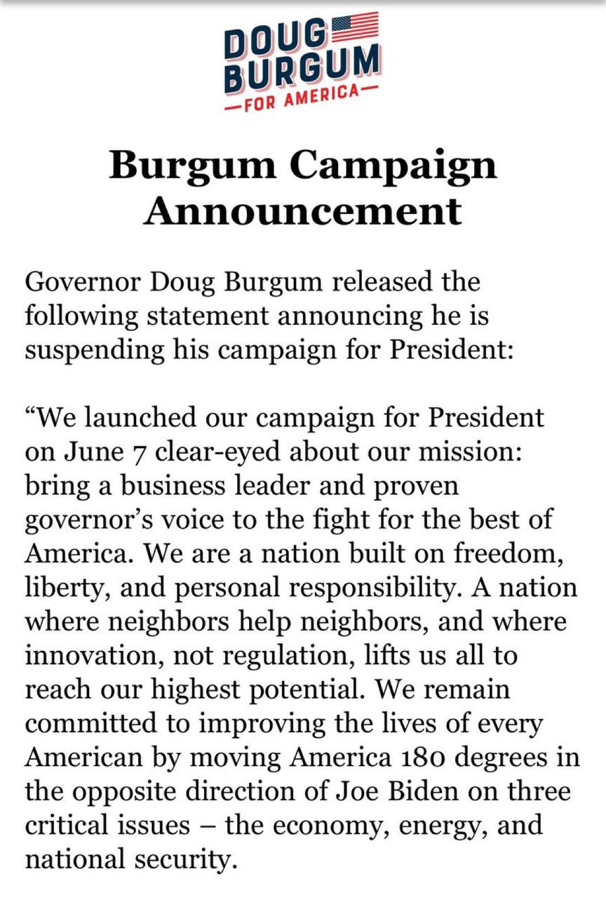 Даг Бургум припиняє кампанію. Враховуючи його низькі рейтинги, навряд чи це на щось вплине, але варто пожалкувати, що дуже хороший губернатор успішного штату не може зібрати голоси.