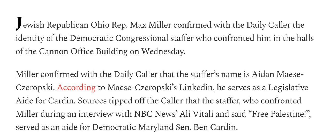 Клерк сенатора демократа Кардіна Айден Мейз-Черопскі, який знімав гейську порнушку в Сенаті, раніше кричав конгресмену єврею Максу Міллеру «Free Palestine».