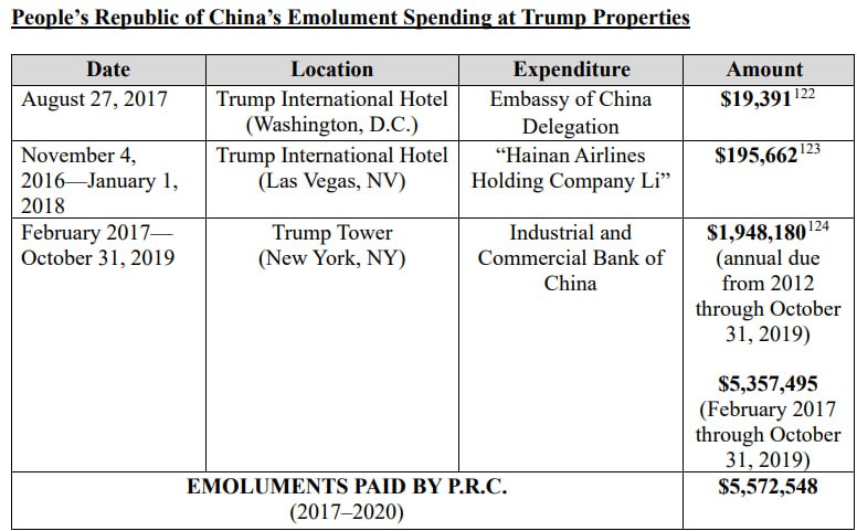 Часто держави оплачували номера в готелях Трампа під час офіційних візитів дипломатів та міністрів, проте найбільший донатер - Пекін також вкладався в бізнес Трампа через державні корпорації та банки.