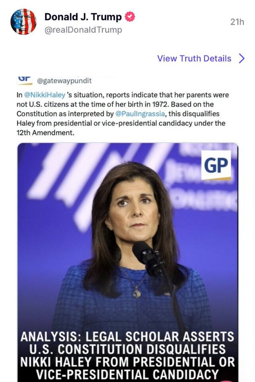 Трамп і його секта тижнями розповідали, що не можна виключати кандидатів з виборів, а зараз сам Трамп розповсюджує маячню, що Ніккі Хейлі треба виключити з виборів 🤷♂️