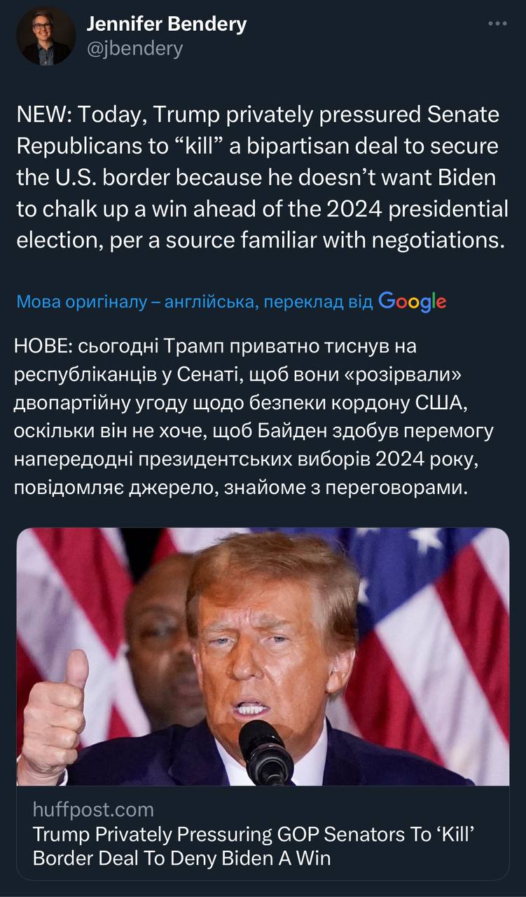 🇺🇸🇺🇦 🇮🇱🇹🇼 «Так званий законопроєкт про безпеку кордонів», якого домагається Байден, не покликаний зупинити нелегальну імміграцію; він покликаний продовжити вторгнення в США, відправляючи «мільярди доларів» в Україну та інші країни — Трамп.
