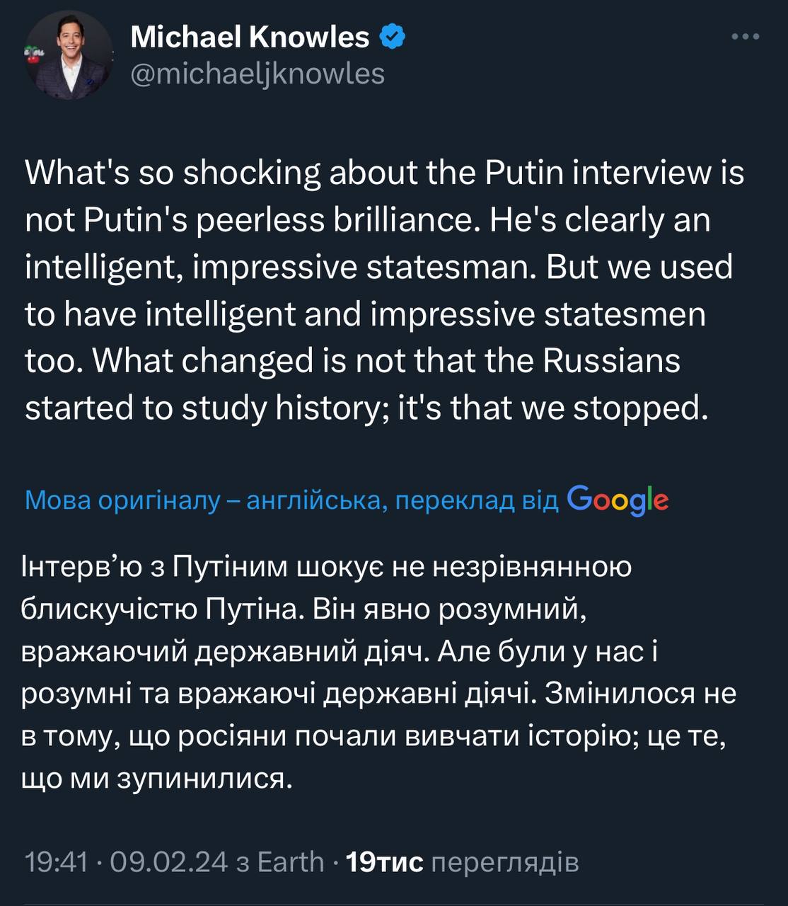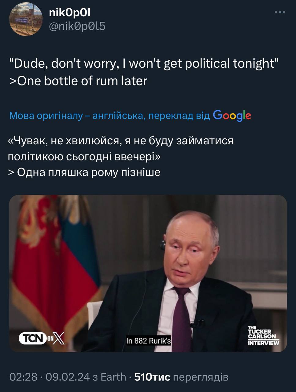 Не знаю наскільки це правда, та і не важливо. Бо реально логічно було б, якби Пітун навалив Карлсону усю ту маячню, яку Такер навалював своїм адептам: типу він «великий борець проти ліберастів і сатаністів», го в альянс проти масонів і діпстейту, від нас приховують правду і бла, бла, бла. Тоді б уся МАГА текла слиною місяць.