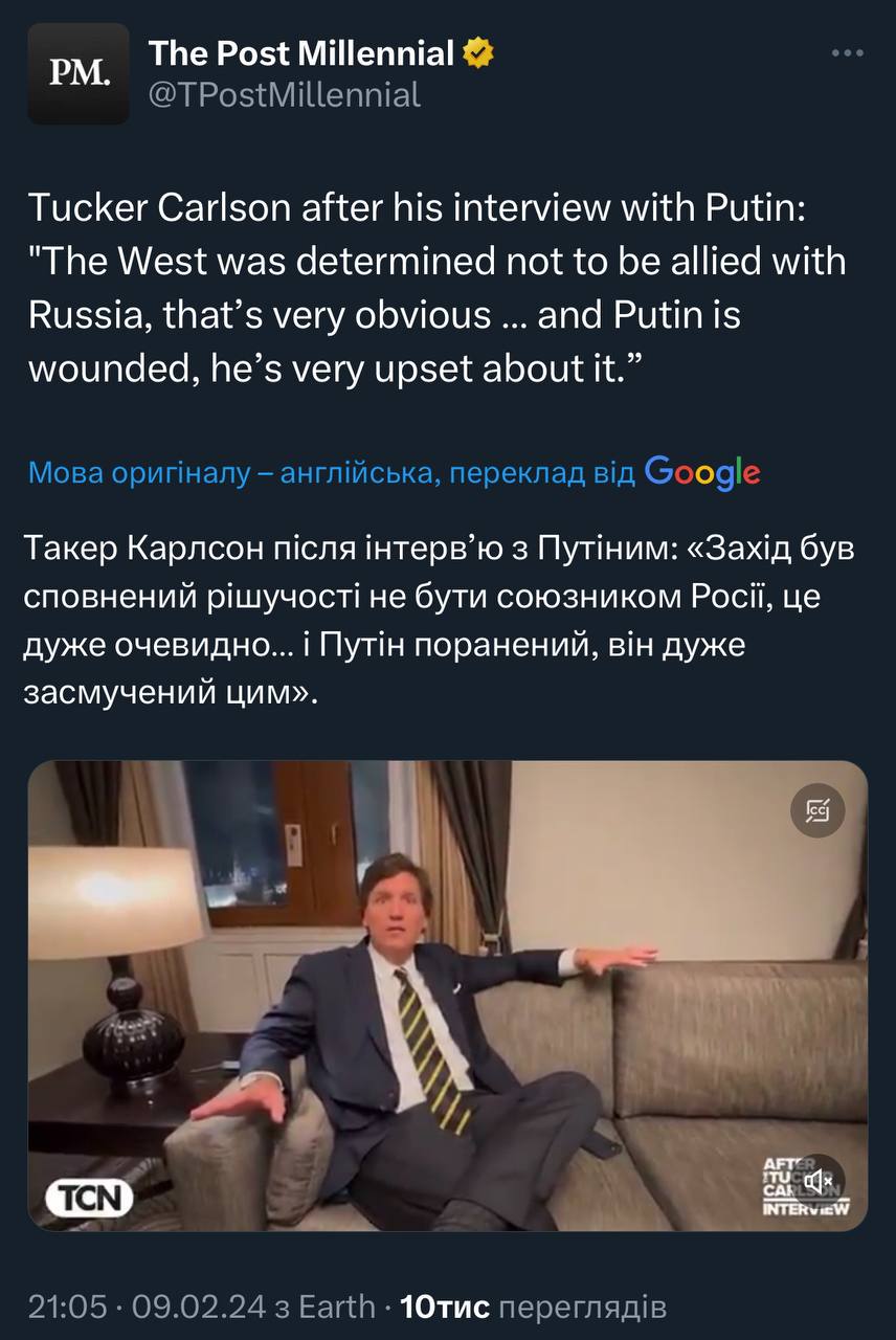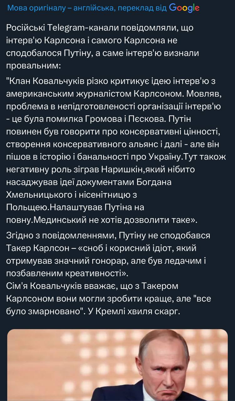 Не знаю наскільки це правда, та і не важливо. Бо реально логічно було б, якби Пітун навалив Карлсону усю ту маячню, яку Такер навалював своїм адептам: типу він «великий борець проти ліберастів і сатаністів», го в альянс проти масонів і діпстейту, від нас приховують правду і бла, бла, бла. Тоді б уся МАГА текла слиною місяць.