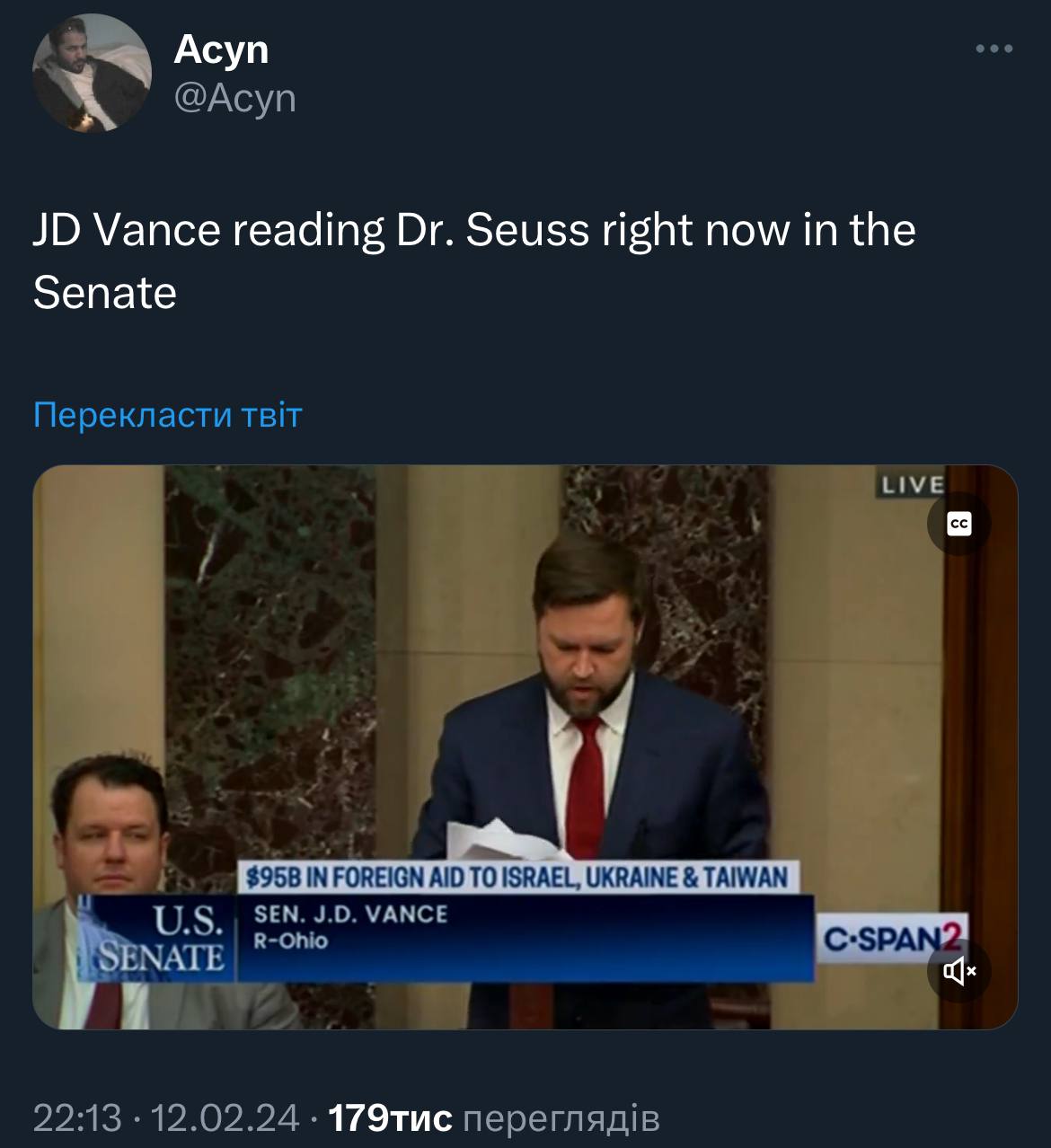 Сенат нарешті пройшов всі процедури і прийняв законопроект про допомогу (зокрема і) Україні з суттєвою двопартійною підтримкою. 70 зі 100 проголосували "за", в тому числі і майже половина (здається 21) республіканців.