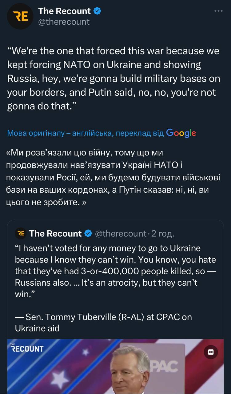 Сенатор республіканець Томмі Табервілль на CPAC розповідає, хто винен у війні. Звісно винні США та Україна, бо хотіли військові бази коло Путіна. Ну і каже, що українці ніколи не виграють, тому він жодного разу не голосував за допомогу і не збирається.