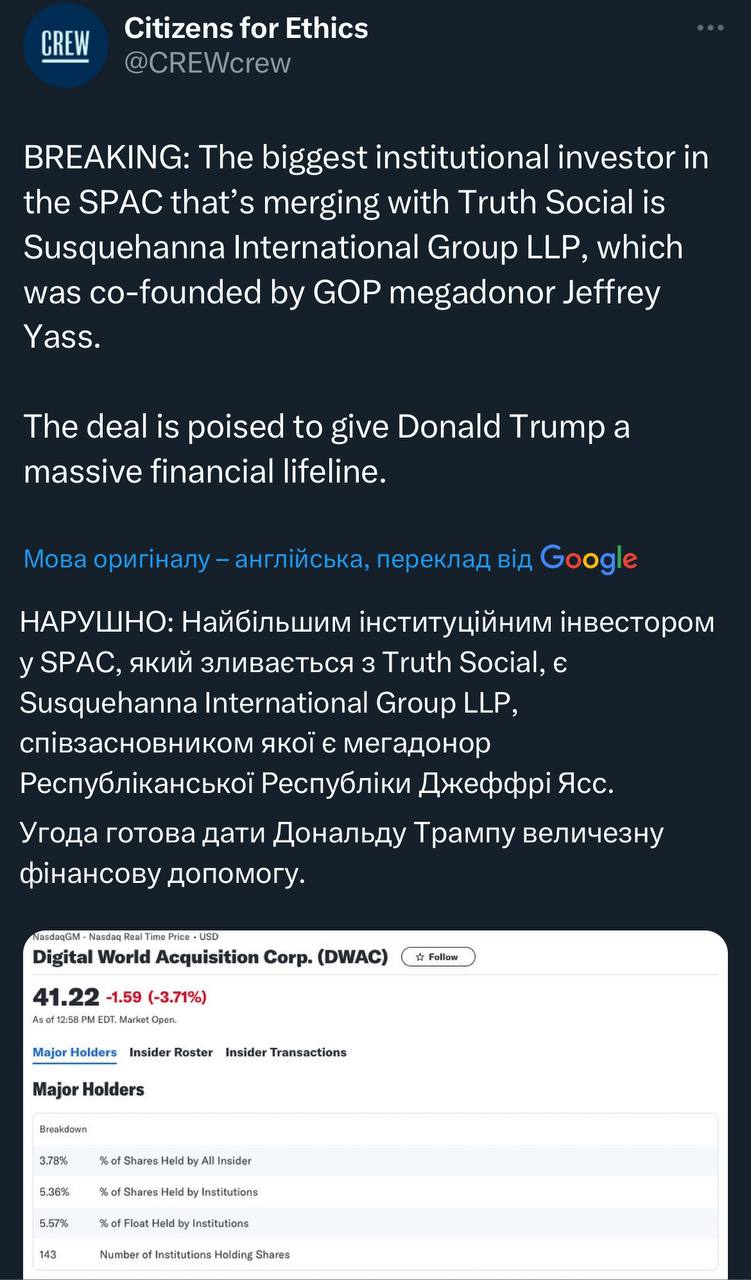 ​​Найбільший американський інвестор у ТікТок Джеффрі Ясс тепер став і найбільшим інвестором у соцмережу Трампа.