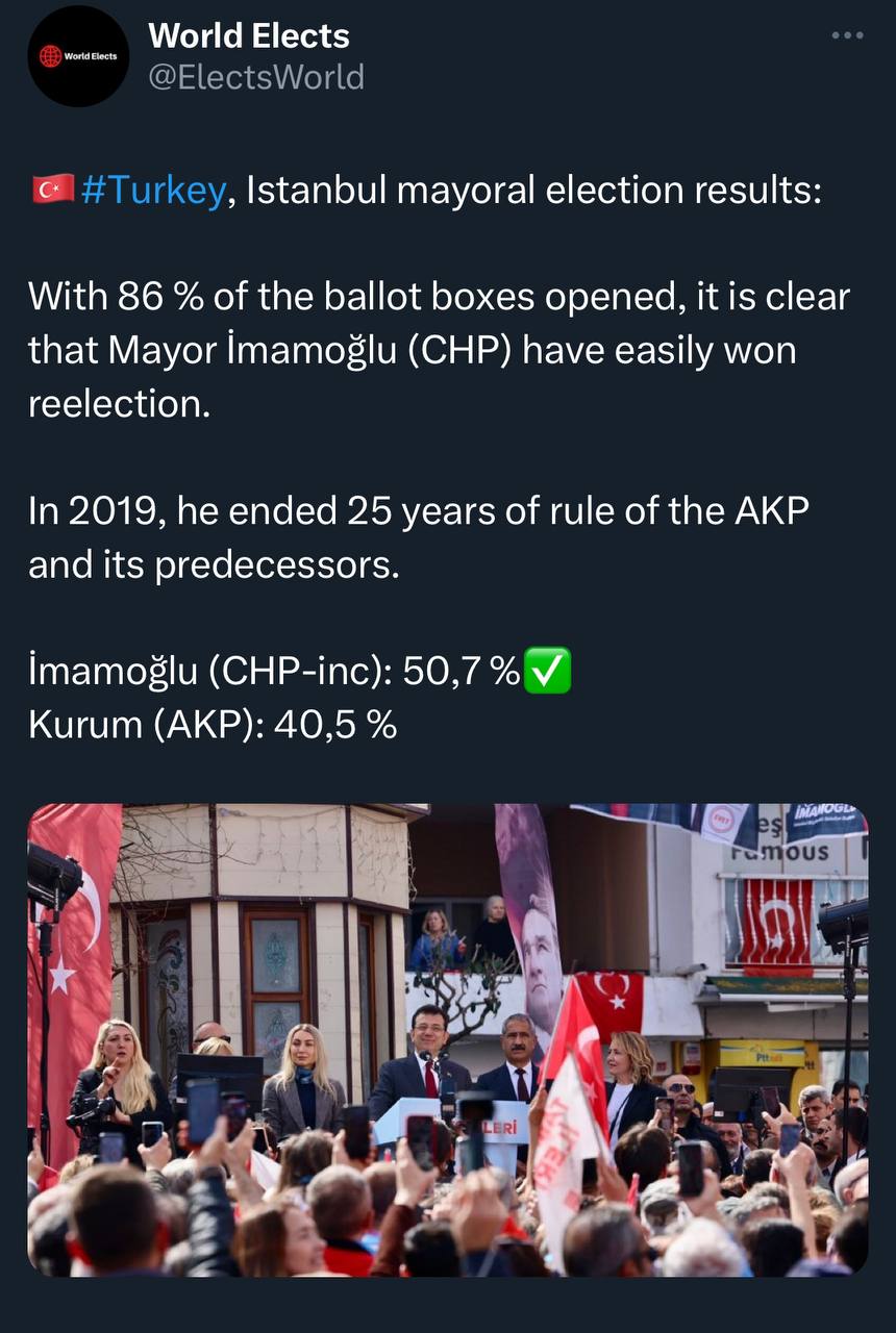 По-перше це місцеві вибори, не треба цього забувати і загальні нарративи типу османізму, мусульманства, імперськості і всієї цієї ахінеї, в якій AKP та їхні союзники з MHP сильні, мають обмежений вплив. Все що можна з цього витис Фатіх Ербакан (син Еджметіна Ербакана, колишнього прем'єр-міністра і "вчителя" Ердогана) та його "Партія процвітання", яка відгризла частину голосів Ердогана і взяла пару муніципалітетів в Анатолії на темі палсестинців. Османізм, брати мусульмани і бла, бла, бла - це добре, але коли вчасно вивозять сміття переживати за справу Гази воно якось легше.