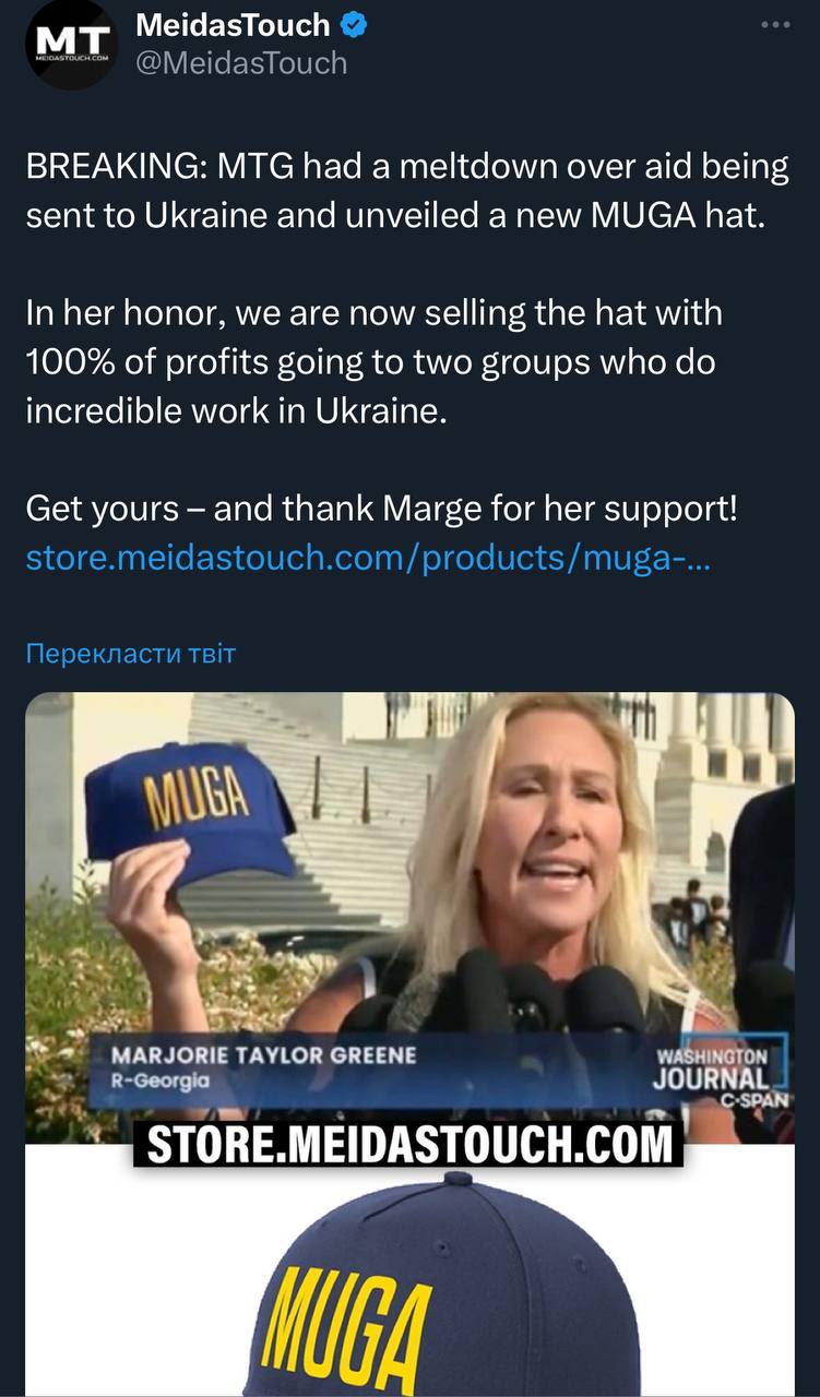 Meidas Touch тепер продає капелюхи MUGA, а кошти направляє групам, які займаються підтримкою України.