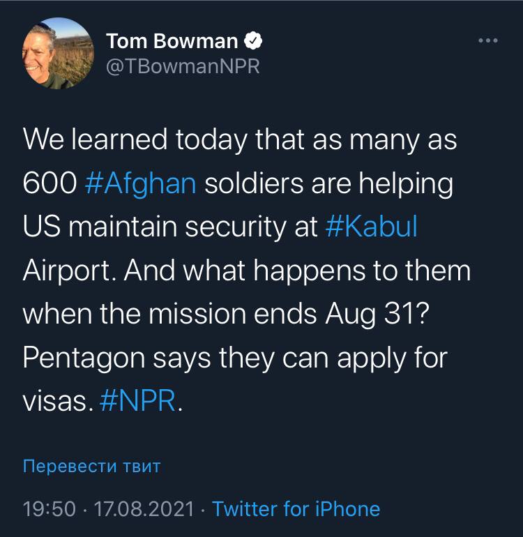 На питання, що з ними буде, коли американці підуть, Пентагон порадив їм «подати документи на візу» (при тому, що на відміну від британського посла, який в аеропорту, американська амбасада вже втекла, куди подавати «документи»?).
