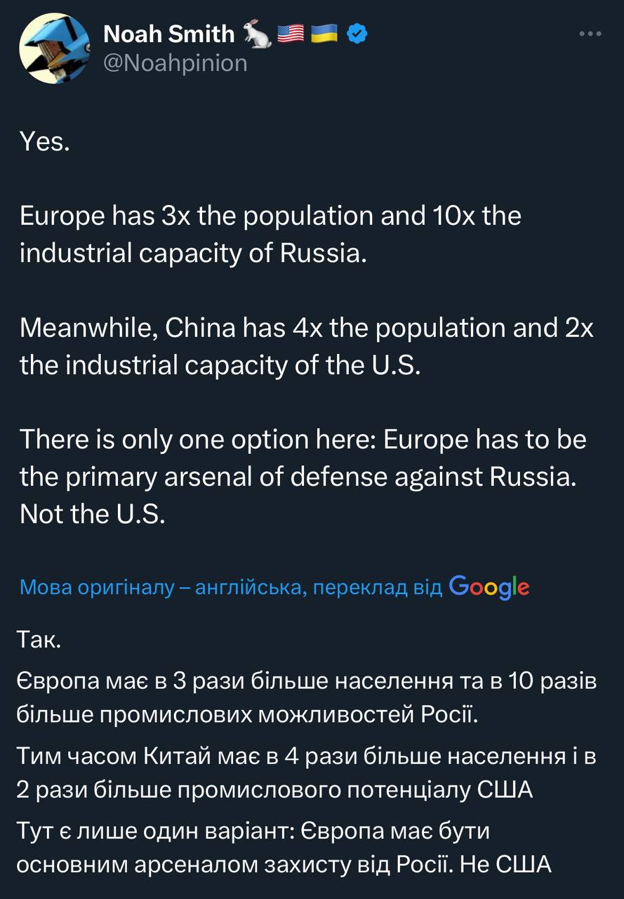 І Європа або реіндустріалізується і відновить військовий потенціал, безумовно ціною жирку бюргера, або «Vae Victis». Часи копіуму і веселкових роздумів про «постіндустріальну епоху» закінчились.