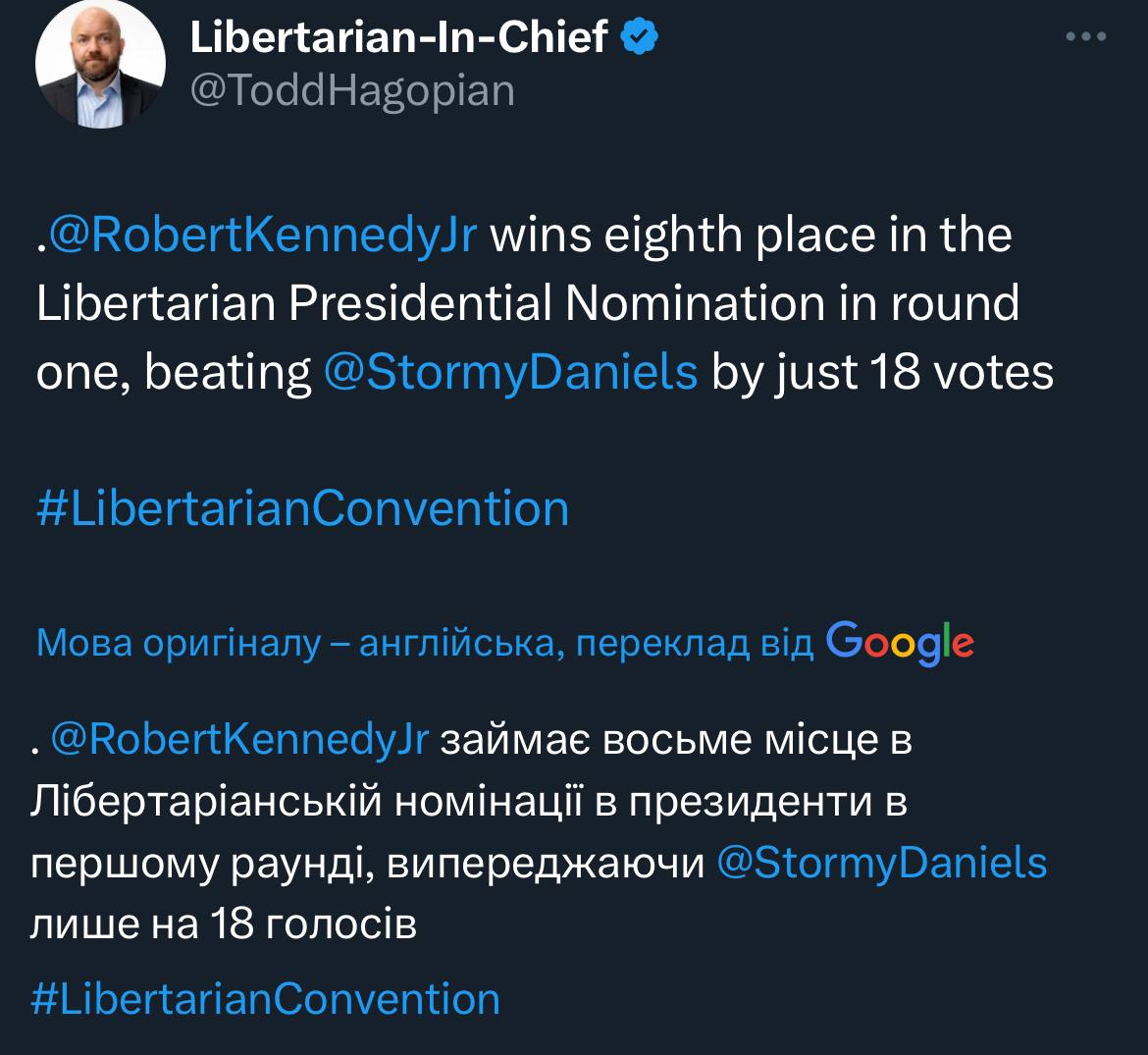 До речі, Роберт Кеннеді-мол. теж намагався стати кандидатом від лібертаріанців, але так само пролетів 🤷♂️