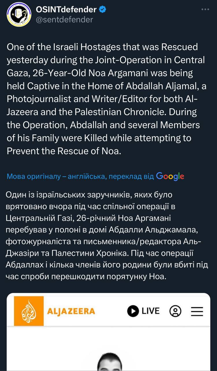 IDF confirms Abdallah Aljamal, Hamas terrorist and news contributor, was holding 3 hostages in his home in Nuseirat alongside his…