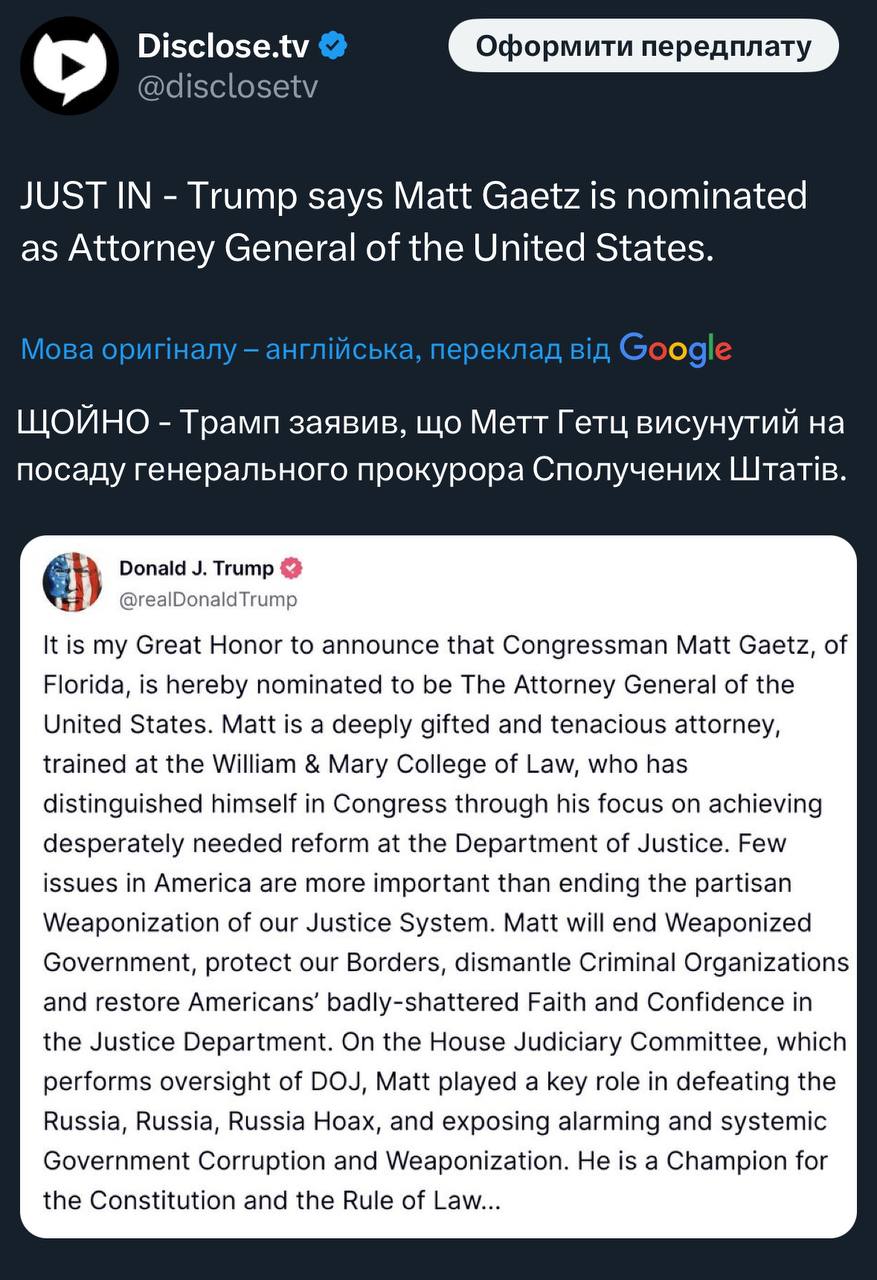 Короче Трамп просто витягнув Гетца з-під удару, він провалиться в Сенаті і номінують когось іншого.