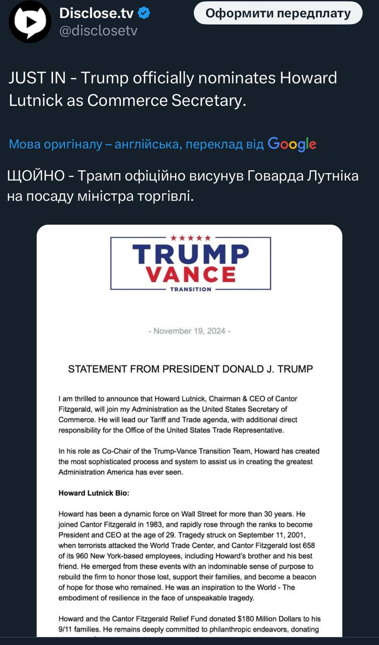 Цікаво тепер подивитись чи наважиться Трамп призначити Бессента, як хотів з самого початку не дивлячись на кампанію проти нього чи обере більш «безпечний варіант»?