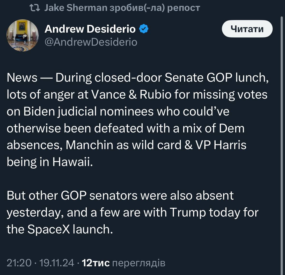 Республіканська партія в Сенаті обурена оскільки замість того, щоб зупинити швидке призначення суддів демократами (дуже лівих, як казав Трамп), частина сенаторів поїхала дивитись запуск ракети разом з Трампом та Маском, в тому числі і Джей Ді Венс та Рубіо, і республіканцям не вистачило голосів (частина демів також була відсутня, тому був шанс)🤷♂️