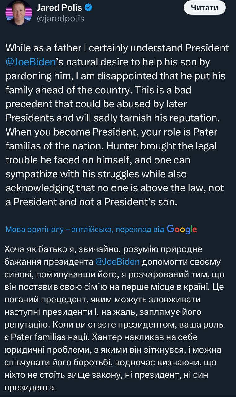 Губернатор Колорадо демократ Джаред Поліс засудив рішення Байдена помилувати сина.