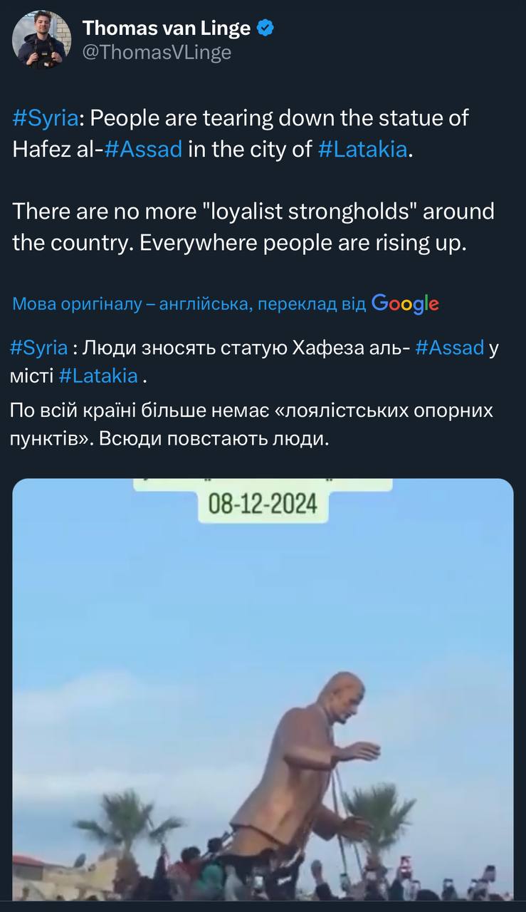 В Дамаску повстанці розгулюють по палацу Асада, і навіть в «лоялістській» Латакії натовп валить статую Асада-старшого. Це остаточний колапс режиму