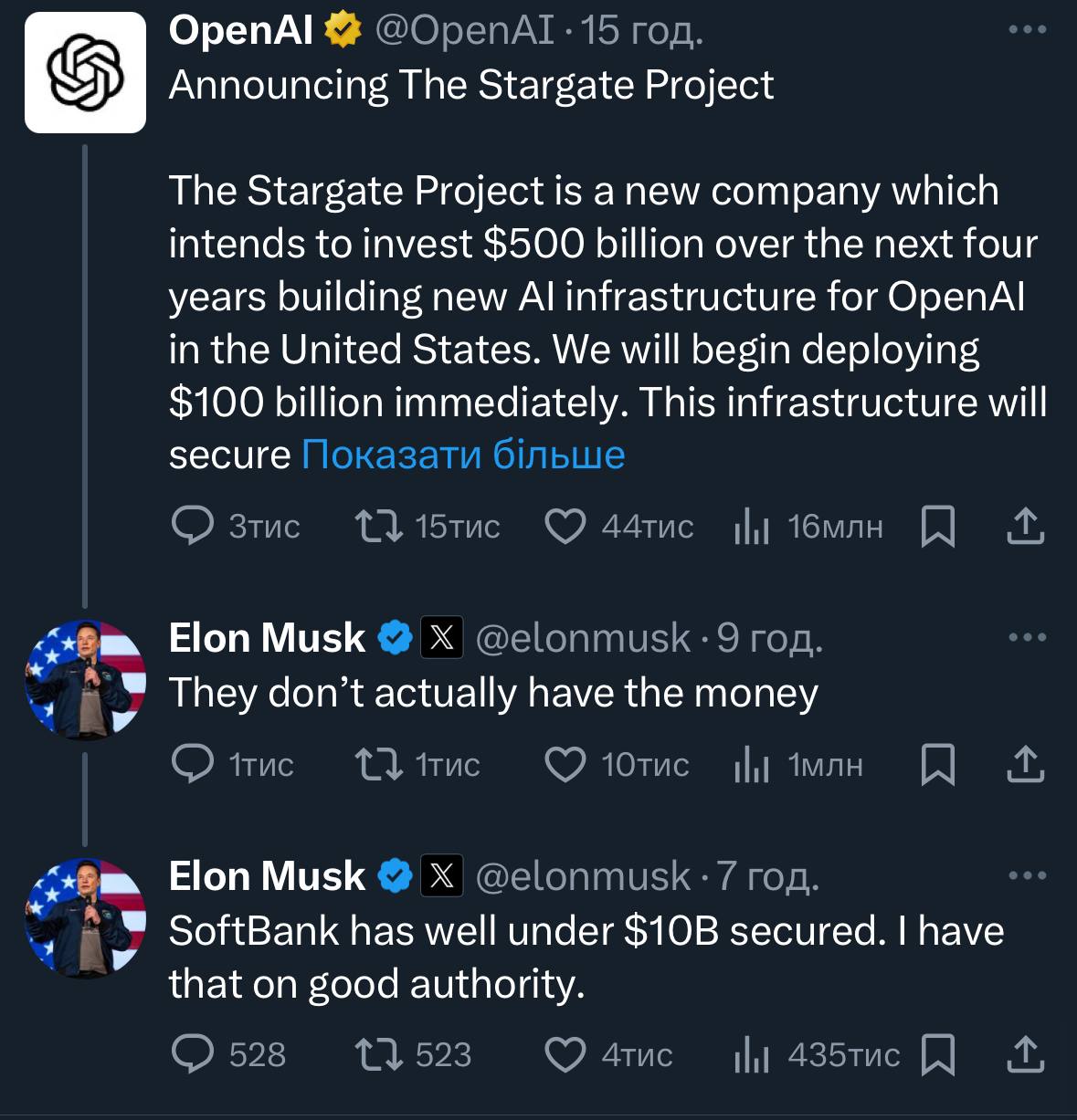 Це класна річ і тут Трампа можна тільки підтримати, але цікаво, що Альтман та Маск терпіти один одного не можуть і Маск намагається наздогнати OpenAI в сфері ШІ. Підтримка Трампом Альтмана певно засмутила "Сципіона Африканського" 😂