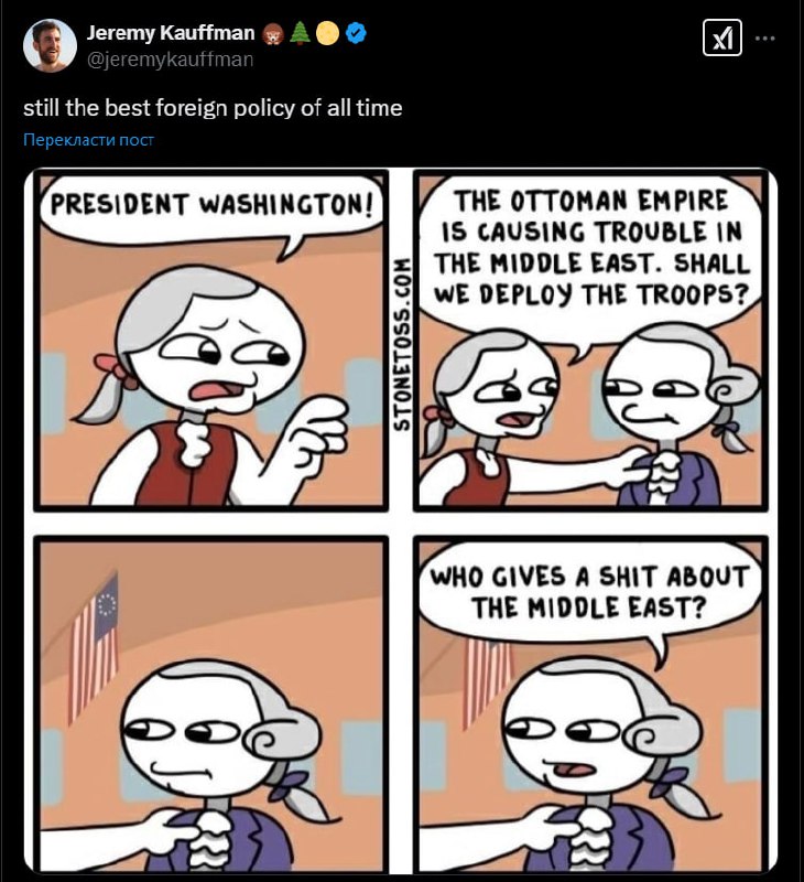 Інколи вражає рівень невігластва тих, хто пилить подібні меми і хто їх розповсюджує. США двічі воювали з Алжиром при Вашингтоні та при Медісоні та Оттоманською Триполітанією та Марокко при Джефферсоні. При Джоні Квінсі Адамсі вони направили флот в Егейське море, щоб воювати з грецькими піратами 🤷♂️